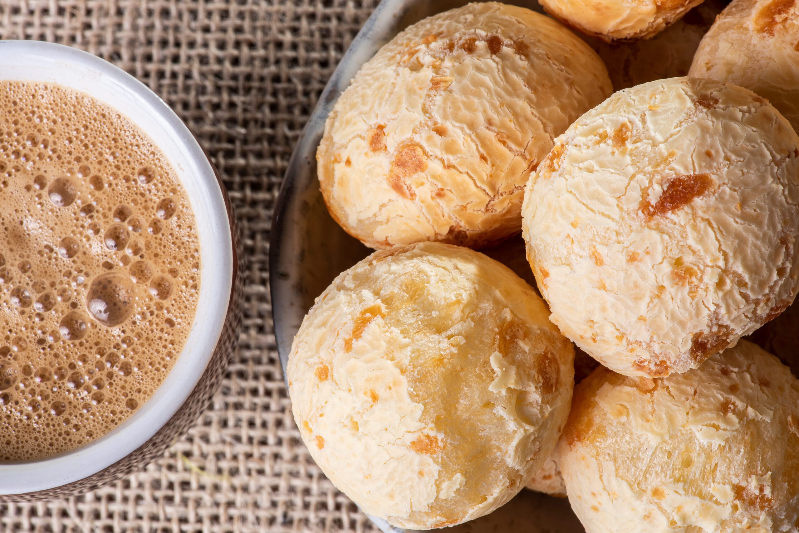 In English: pão de queijo (Brazilian cheese bread) is a small, round, gluten-free cheese roll made from cassava starch, eggs, and cheese. Crispy on the outside and soft, chewy, and cheesy on the inside — it's one of Brazil's most beloved and internationally recognized foods.